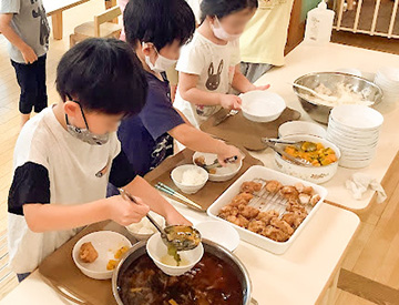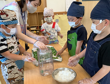 日々のおいしい食事はもちろん、季節の行事食、クッキング保育など、工夫を凝らした体験をとおして、食事の楽しさや感謝の気持ちを育みます。
