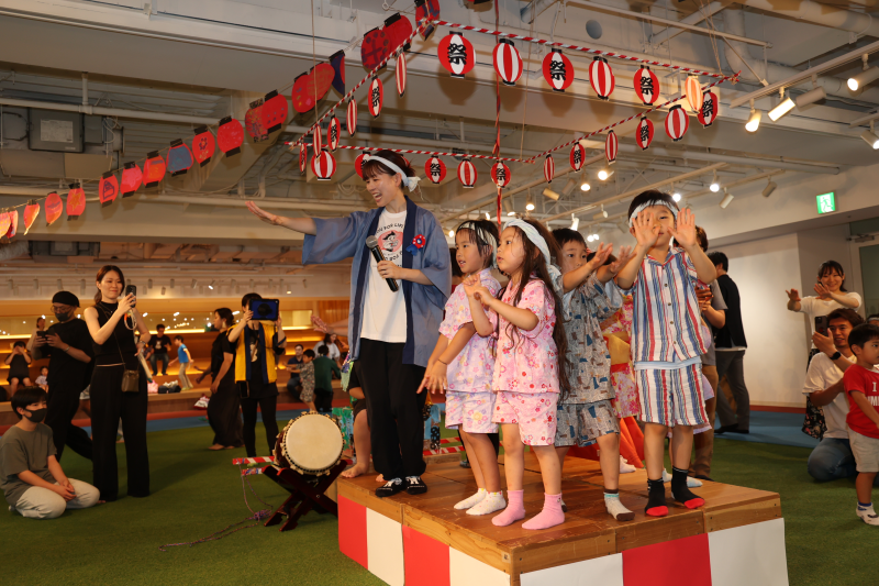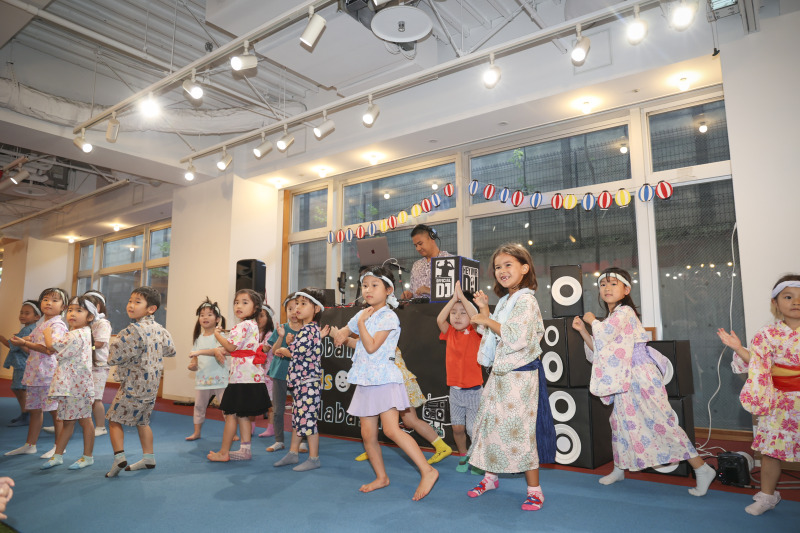 最後は「APT(炭坑節バージョン)」で、盆踊り会はまるでフェス会場のように大盛り上がり!さらに、和太鼓ができる6年生の卒園児も太鼓を叩いてくれました!子どもたちは、日頃から遊びの中でダンスをしていたので、同じ曲をかけるとすぐに踊り出し、みんなで「Let's dance!!」