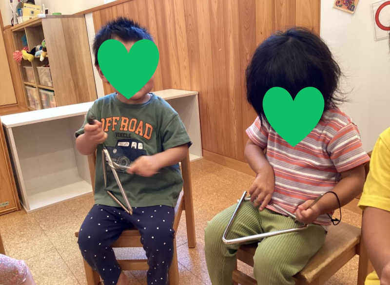2歳児エメラルド組です。今日は室内で楽器遊びを行いました。