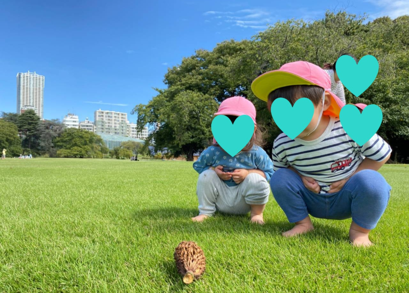 日々の活動では、散歩に出掛けることが多く、自然物に触れる機会もたくさんあります。自然のある公園が多くある地域で、秋の遠足では新宿御苑に出向くに行くこともあります。