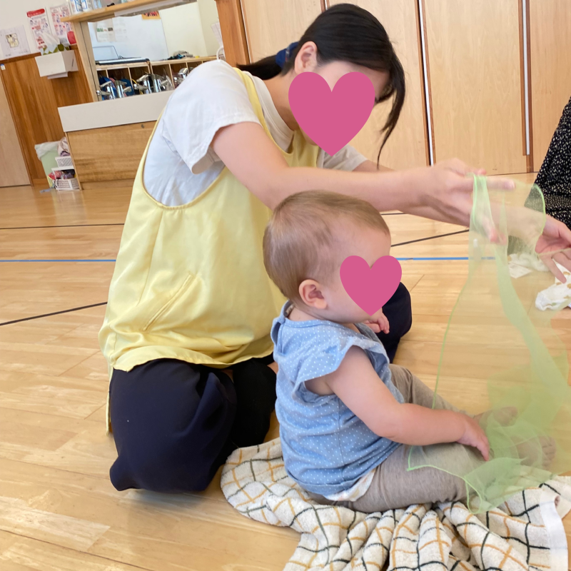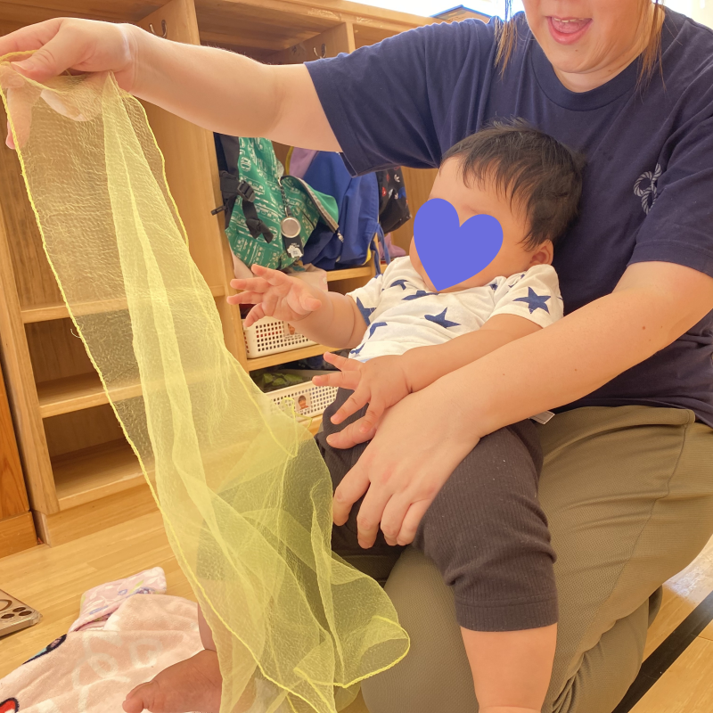 すぐに、マッサージにいくわけではなく、シフォンスカーフを使って、物を追う目線を刺激したり、遊びを取り入れたりしながら、リラックスしていきます。