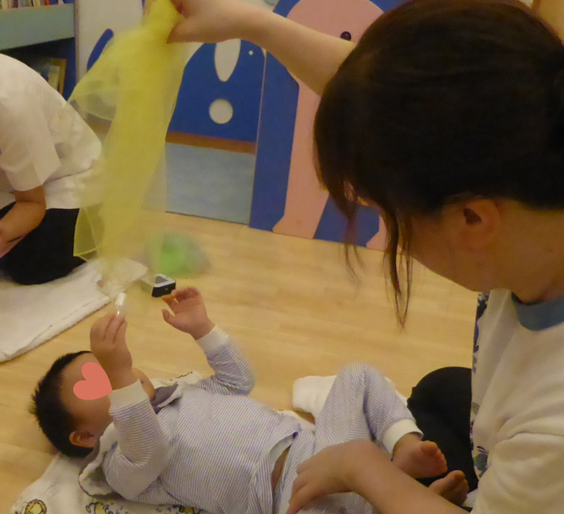 今回もシフォンスカーフを使って、遊びからスタートしましたが、途中、足のマッサージも入り、参加している赤ちゃんの様子にあった、プログラムを行なってくださいましたよ。