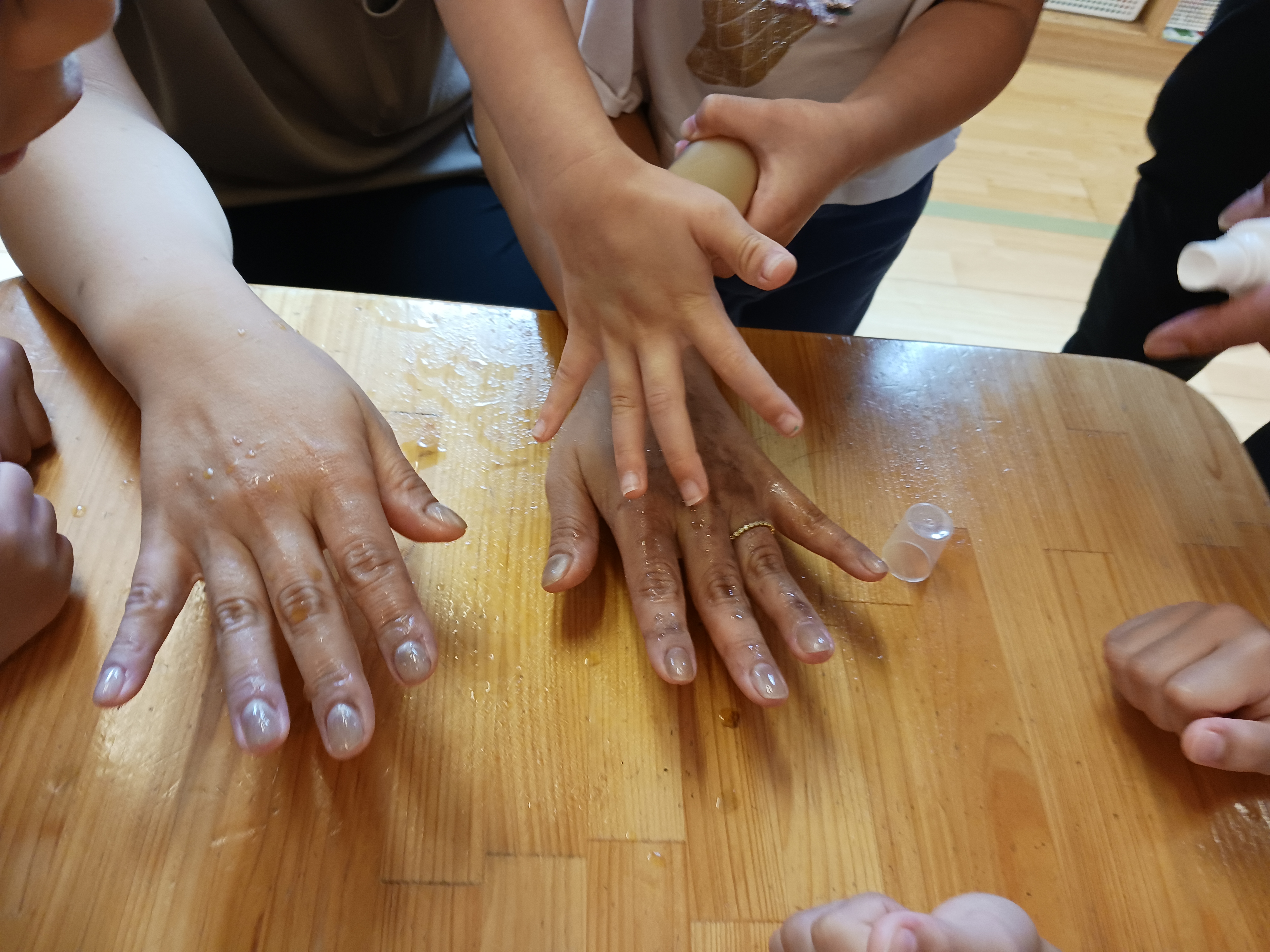 でんぷんのりを手に塗った後、それぞれいつも通りの手洗いをします。