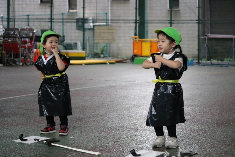 3歳児クラスの子ども達は、忍者のダンスをしました。手裏剣や刀・吹き矢を使ってなりきっていました。