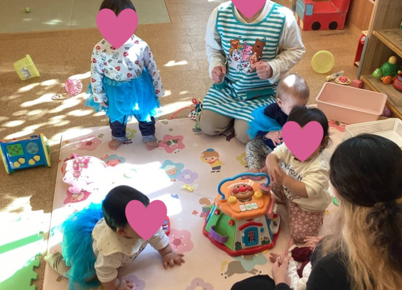 0歳児クラスでは室内でおもちゃで遊んでいました。