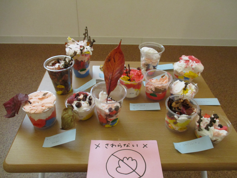 2歳児は紙粘土をカップに詰めて、拾ってきたどんぐりや落ち葉をトッピング。