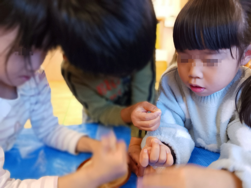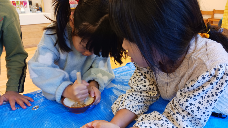 ↑4・5歳児クラスのおともだちで脱穀・精米にチャレンジ☆