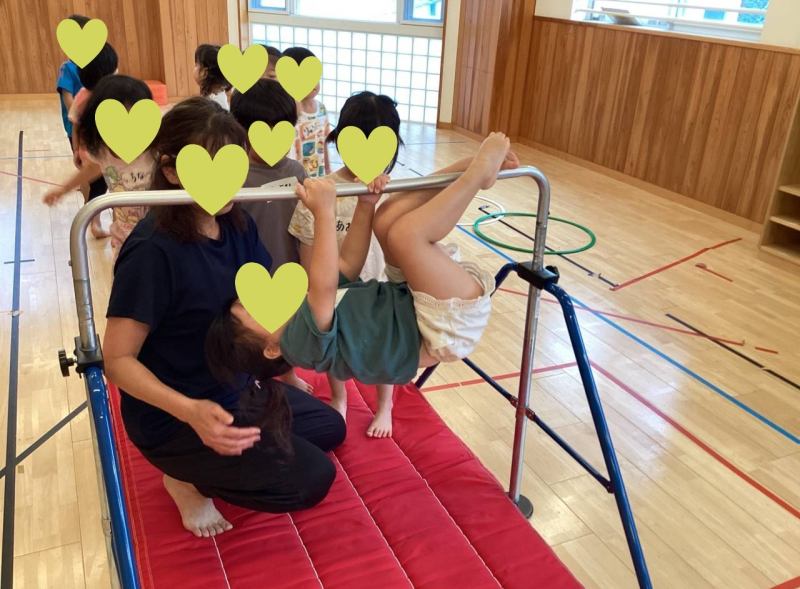 体操では体を動かす楽しさ(動物の動きやダンス)、機材を使った体操(マット、跳び箱、鉄棒)をしています。