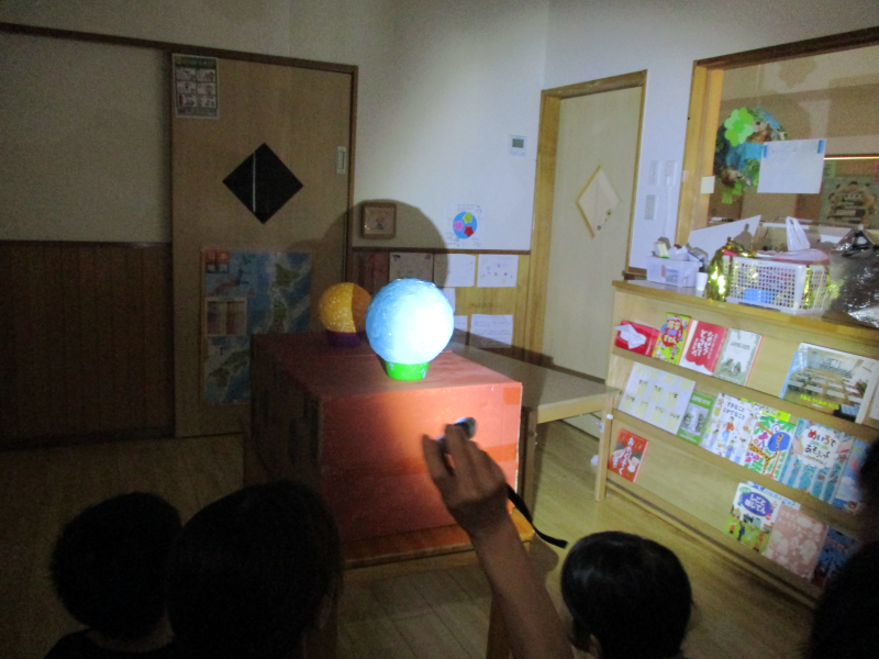 9月8日の皆既月食をきっかけにぞう組に宇宙コーナーを作りました。また、地球と月の模型もコツコツを子どもたちと園長先生と一緒に作っていました。