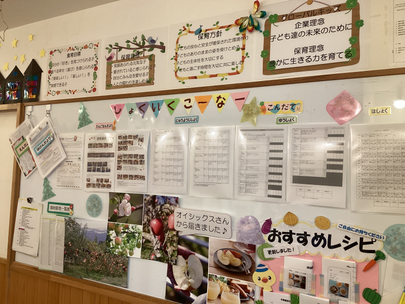 玄関を入ると左手に下駄箱があります。右手のホワイトボードでは、❝食育コーナー❞で食材の業者さん(オイシックス)からの食材教材や「えんごはん」で人気のレシピなどを掲示しています。