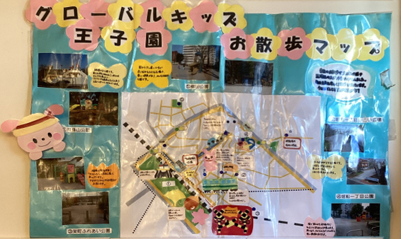 手作り散歩マップでは、近隣の公園など子どもたちと一緒に行く公園を載せています。王子園の周りには乳児向けの公園が多く、もちろん目の前にある飛鳥山公園にも行きます。季節の植物に触れられる大きな公園がそばにあることはとても良い環境です♪