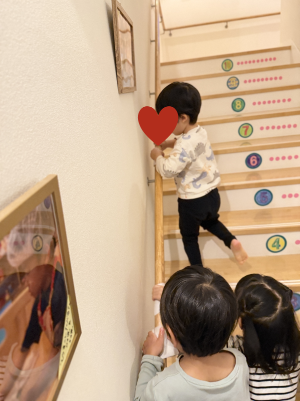 2歳児エメラルド組は階段の手すりと階段のふき掃除をしてくれました。