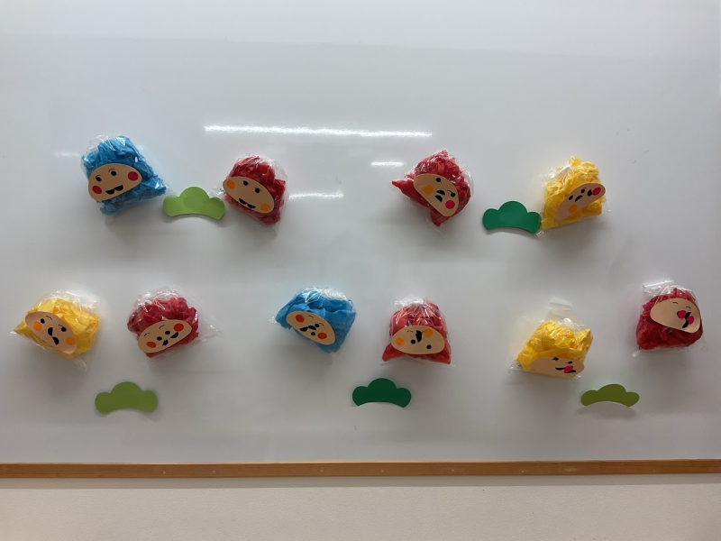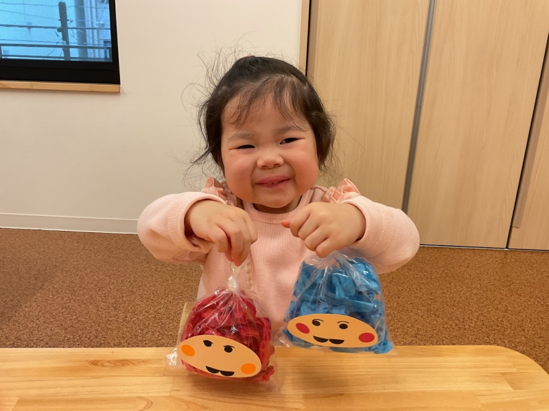 【制作】好きな色のお花紙を丸めて詰めてお顔のシールを貼ると、ダルマさんが出来ました。完成してとっても嬉しそう。