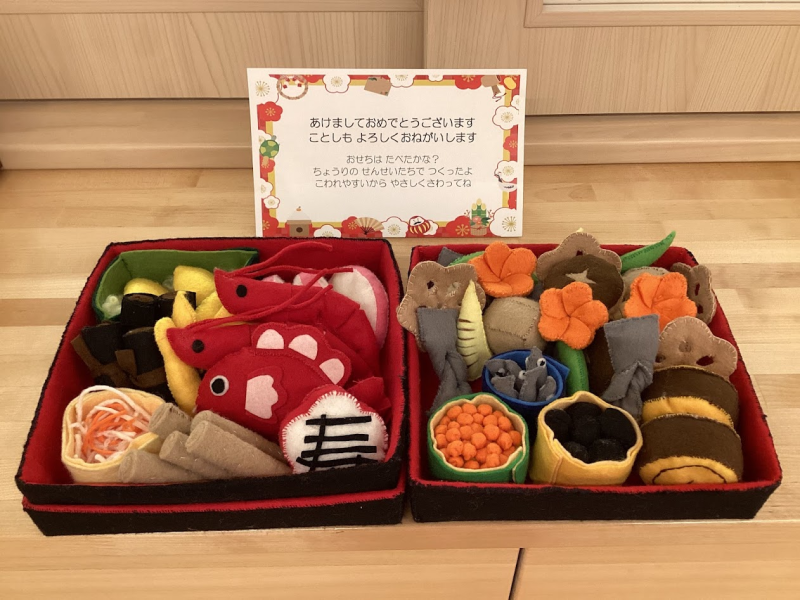 【おせち】調理さんが作ってくれたフェルトのおせちです。登園をすると、お母さんやお父さんと「これ食べたね」と食べたものを確認したり、「伊達巻たべたよ!」と嬉しそうに保育者に教えてくれました。
