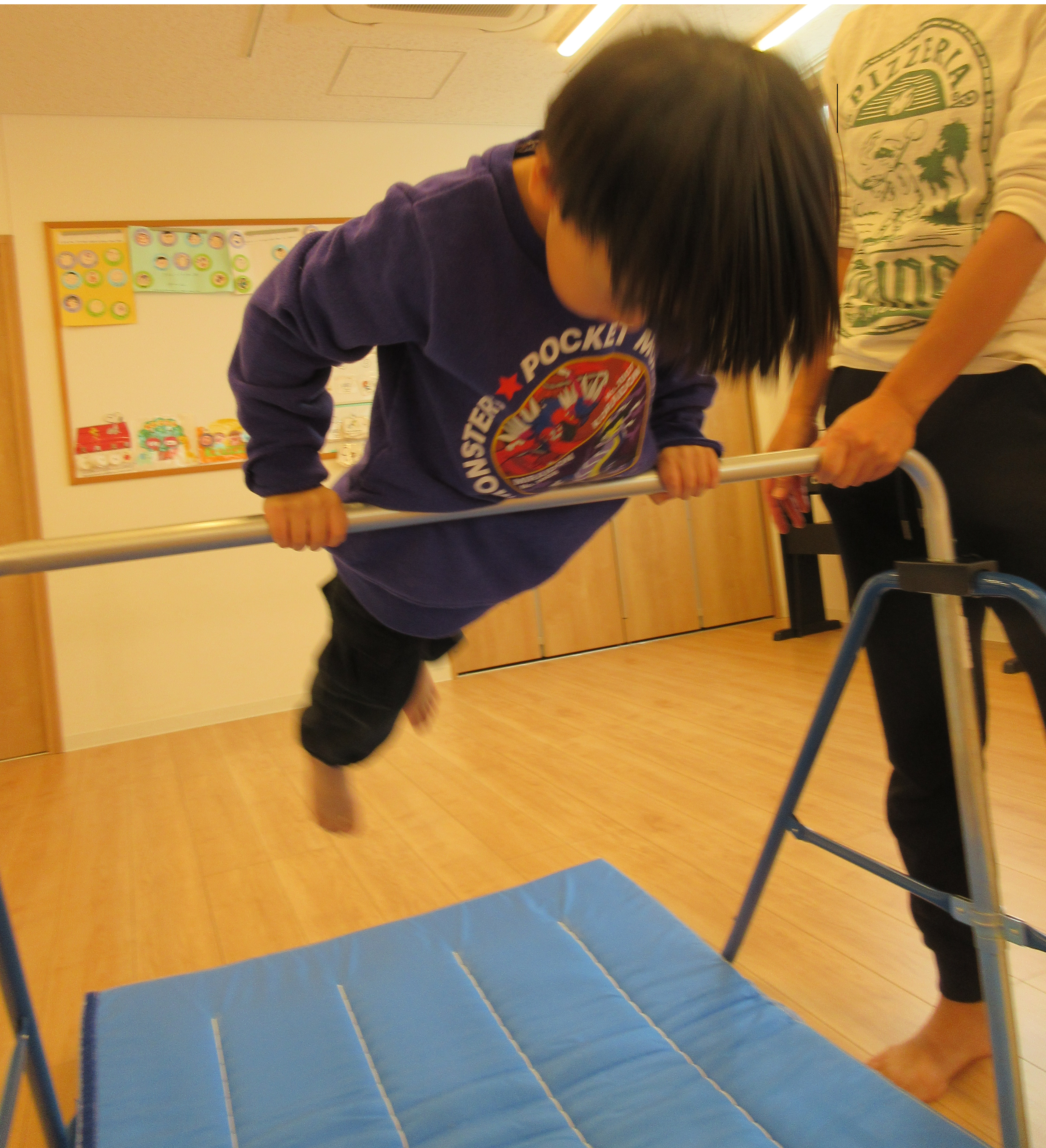 室内用の鉄棒は高さの調節ができるので、子ども達がジャンプしてあがれる高さにしています。