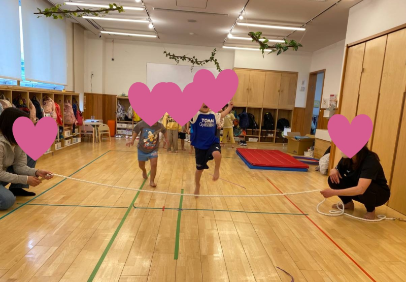 柔軟や走って遊ぶ体操をしてから、うつ伏せに寝てワニのように歩いて縄跳びの下を潜って進んだり、迫ってくる縄をタイミングよくジャンプして避けたりと、ゲームのように楽しく身体を動かしていました。