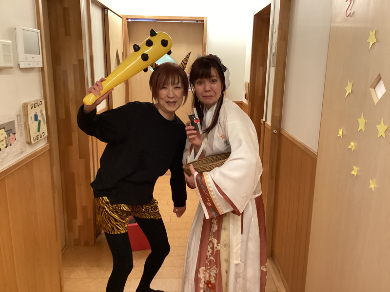 りさ先生です。(右の福の神様をしているのは園長先生です。園長先生の紹介はまた後日、お届けします♪)