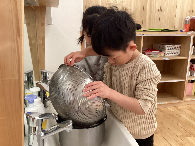米飯の日は、朝に4・5歳児のお当番が仕事として幼児クラス(3・4・5歳児)分のお米研ぎをし、炊飯します!