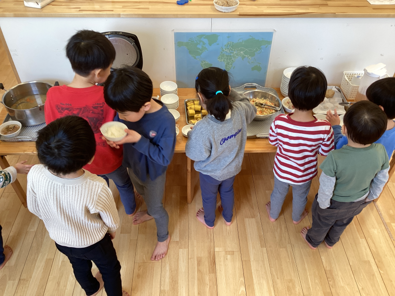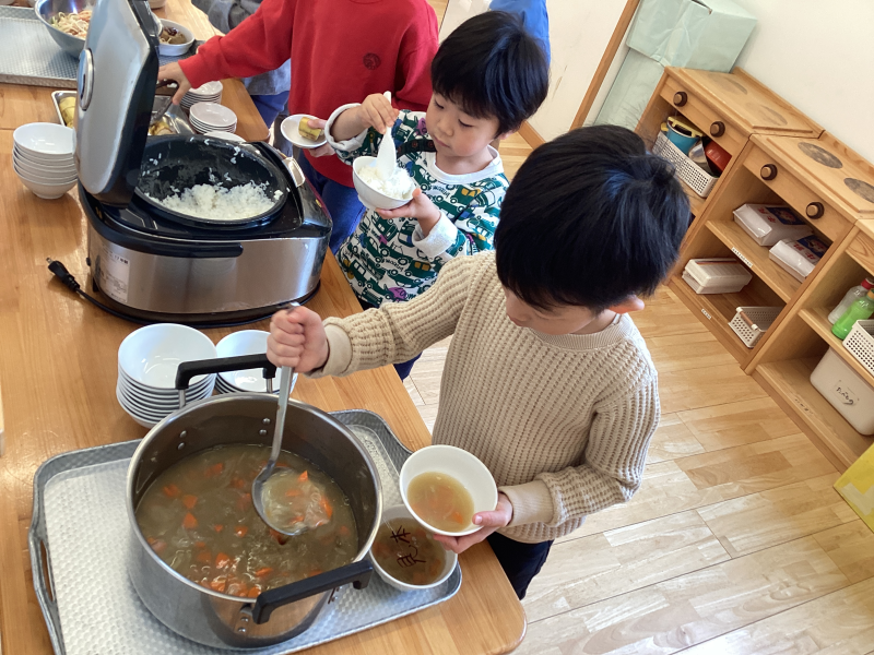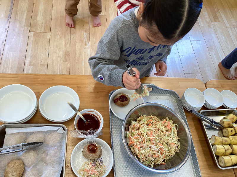 最初の頃は保育者と一緒に準備をしていた子どもたちも、今では1人で盛り付けられるようになってきました⭐︎