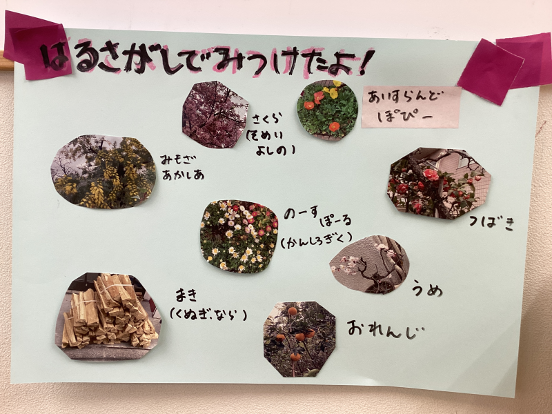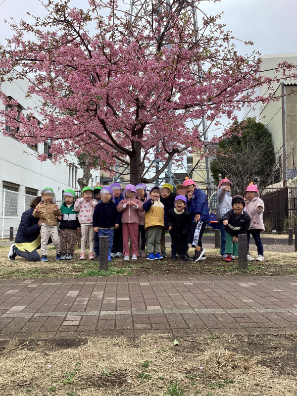 この日は、3,4,5歳児クラス異年齢活動で、『春さがし』をテーマに散歩に出向きました!