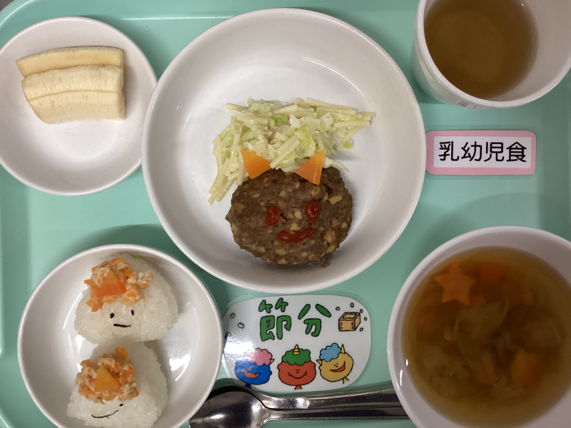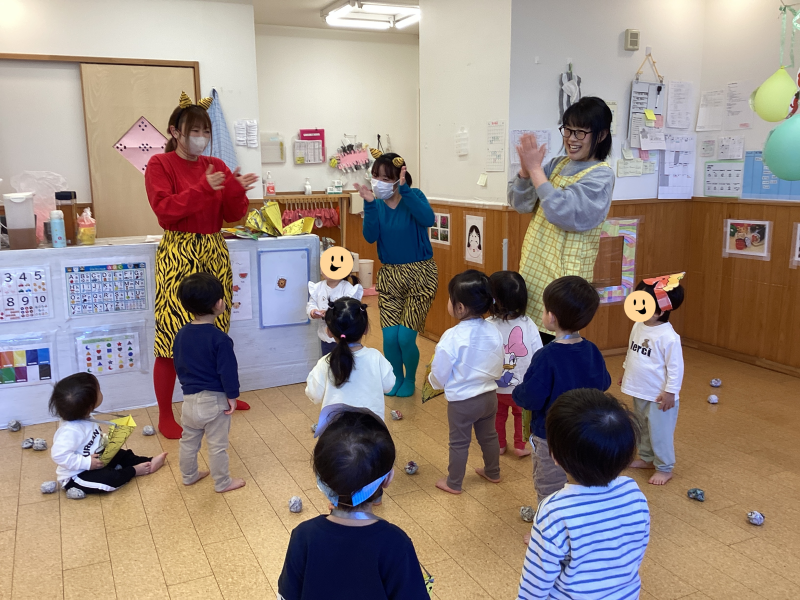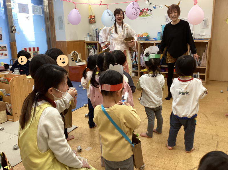 王子園に優しい鬼さんが登場しました!怖がることなく、みんなで楽しく「鬼は外~♪福は内~♬」と新聞紙で作った豆を投げ、元気いっぱいに邪気を払いました!