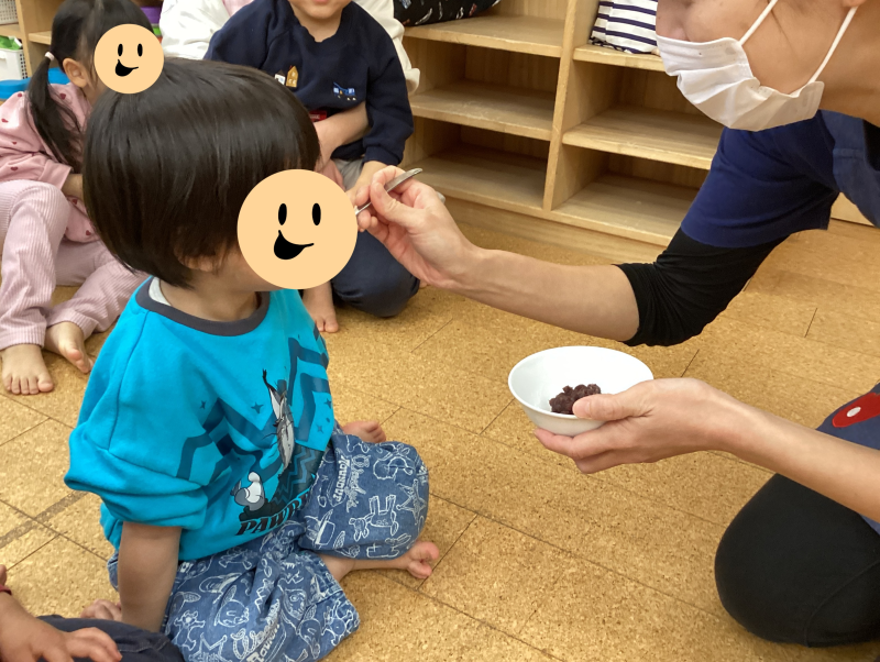 1年間、子どもたちが元気に笑顔で過ごせますように・・と願いを込めました。魔除けや厄除けの意味もある「小豆」の試食もし、みんな「あま~い♡」と小豆の味を堪能していました。