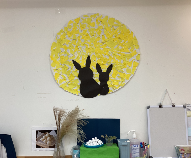 まんまるの大きなお月様がお部屋に飾られました!子どもたちが作った、粘土のお団子をお供えして、これからもみんなが健康でありますように・・とお願いしました。