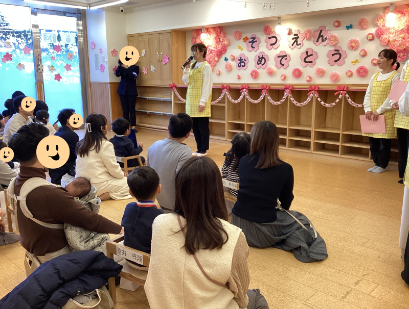 王子園で1年の最後の大きな行事となる卒園お祝い会。温かい雰囲気の中で、保護者も子どもたちもそして私たち保育者も楽しく行うことが出来ました。