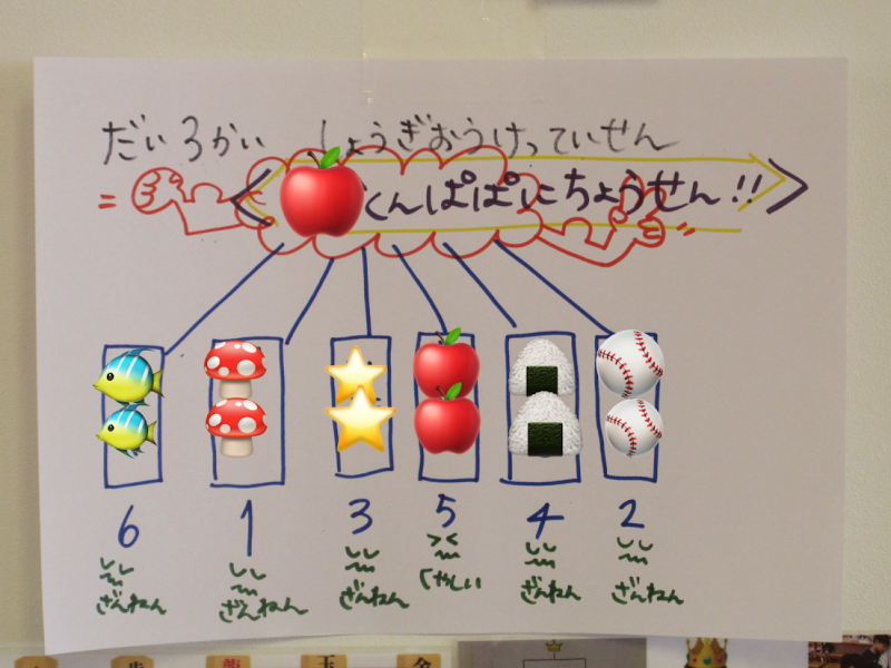 「(りんごマーク)くんぱぱに勝つぞー!!」とやる気いっぱいの子どもたち。