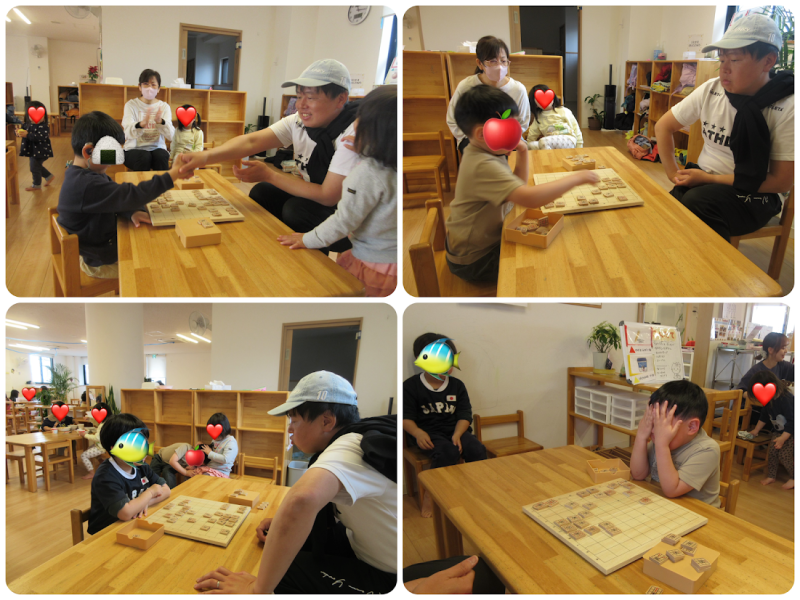 パパも本気で戦ってくれ、みんな負けてしまいましたが、保育参加後ももう一度それぞれ将棋をやってみる姿が見られ、まだまだ将棋ブームは続きそうです。