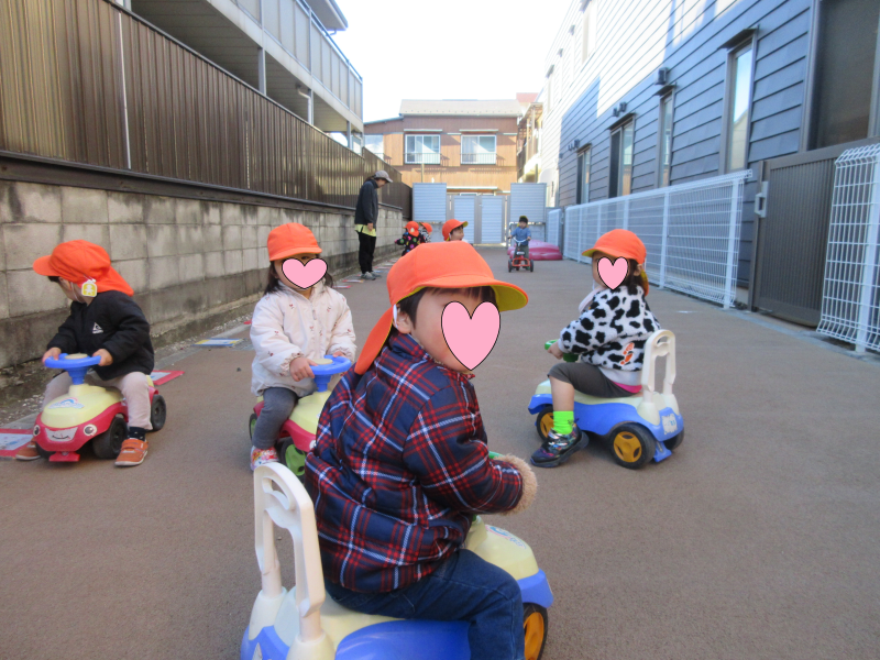 乳児さんたちは園庭で、コンビカーや三輪車を楽しんでいます。