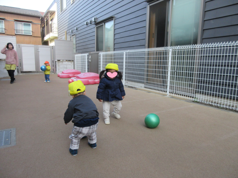 よちよち歩きの0歳児クラスもボールあそびや、歩くことを楽しみ、